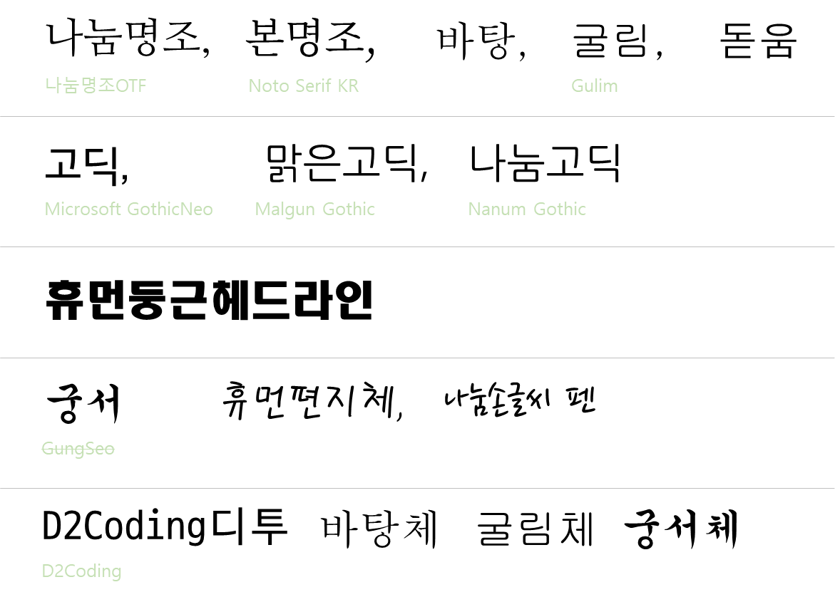 - 명조 : 나눔명조, 본명조, 바탕, 굴림, 돋움