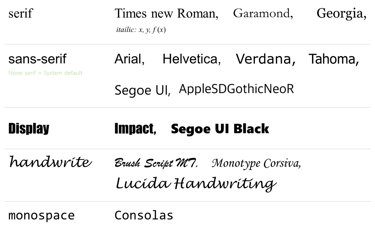 - sans-serif : Arial, Helvetica, Verdana, Tahoma, Segoe UI, AppleSDGothicNeoR